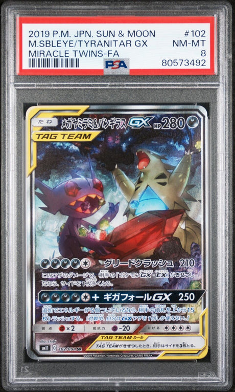 - PKMhobby - PSA 8 NEAR MINT JAPANESE POKEMON 2019 M.SBLEYE/TYRANITAR GX 102/094 TWINS SM11 Regular price $135.00Unit price /Unavailable