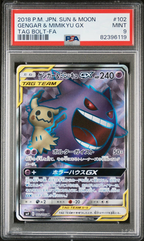 - PKMhobby - PSA 9 MINT JAPANESE POKEMON 2018 GENGAR & MIMIKYU GX 102/095 TAG BOLT SM9 Regular price $135.00Unit price /Unavailable