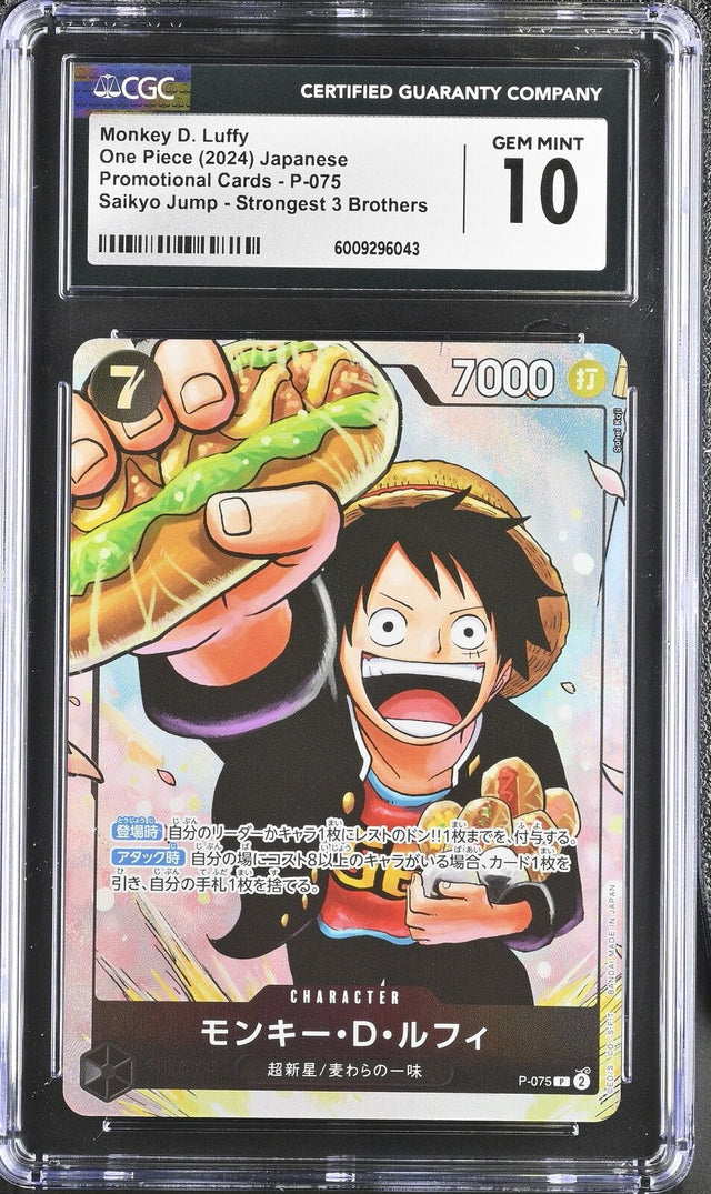 CGC 10 GEM MINT Japanese One Piece 2024 Monkey D. Luffy P-075 SAIKYO JUMP is backordered and will ship as soon as it is back in stock.