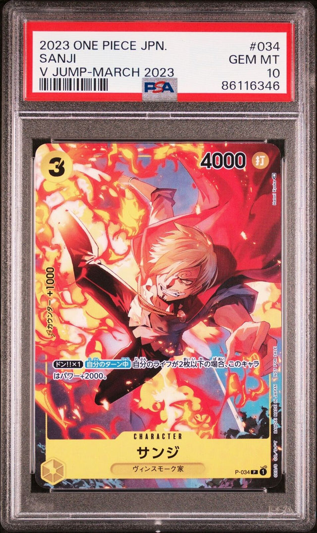 PSA 10 GEM MINT JAPANESE ONE PIECE 2023 SANJI P-034 V JUMP-MARCH 2023