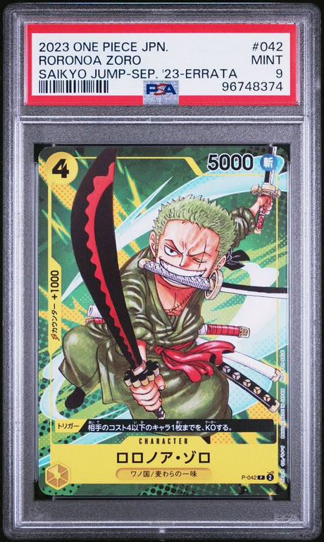 PSA 9 MINT JAPANESE ONE PIECE 2023 RORONOA ZORO P-042 SAIKYO JUMP-SEPT.