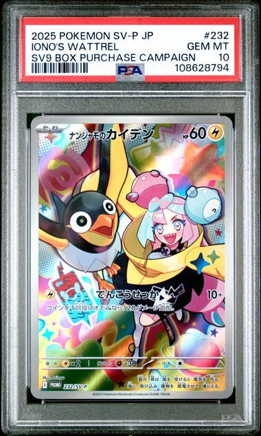 - PKMhobby - PSA 10 GEM MINT Japanese Pokemon 2025 Iono's Wattrel 232/SV-P Promotional PROMO Regular price $63.00Unit price /UnavailableVery low stock (1 unit)