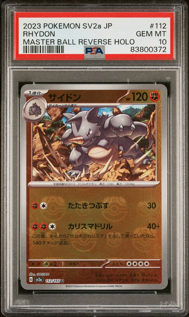 PSA 10 GEM MINT JAPANESE POKEMON 2023 RHYDON 112/165 MASTER BALL 151 SV2a is backordered and will ship as soon as it is back in stock.